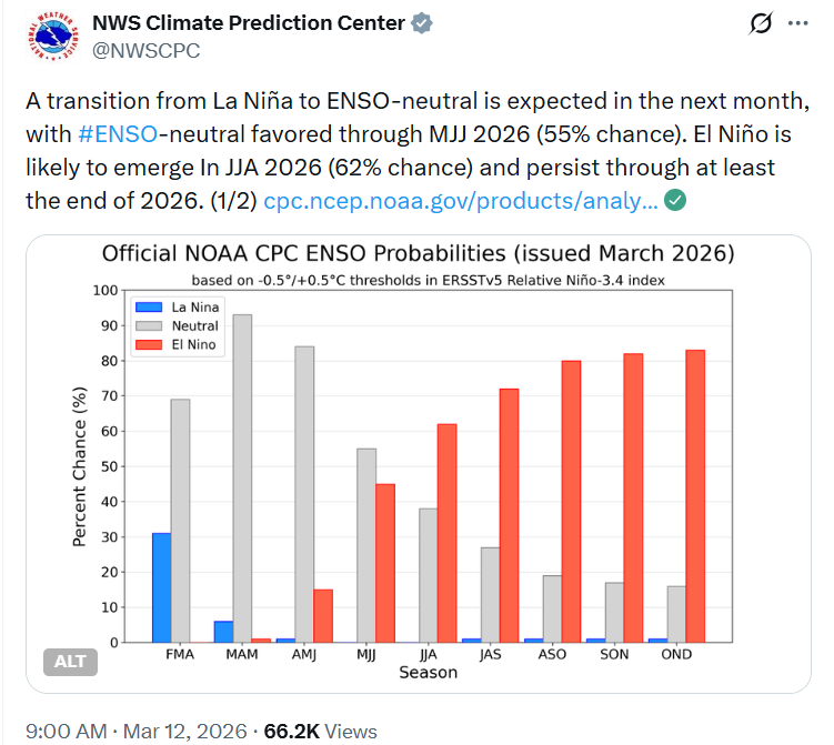 2-17-26: This La Nina has weakened the fastest ever with Pacific water temperatures really warming fast now. We should assume that means El Nino conditions and analogs should be adjusted accordingly. For instance, the current forecast for El Nino by late Summer should be MOVED UP. In fact, considering the lag time issue mentioned above, I would move up the El Nino impact to THIS SPRING with regards to real world, empirical data based weather condition analogs.