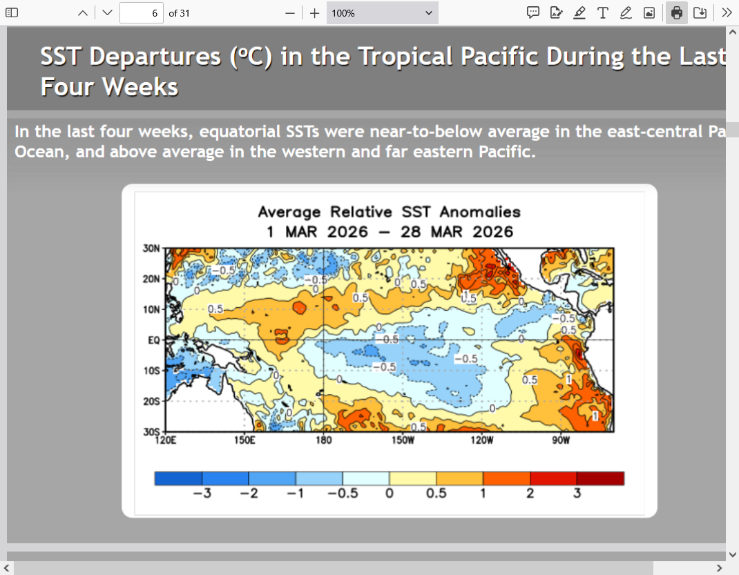 One of the few places with a colder than average ocean on the planet right now is the most important one. The East/Central tropical Pacific that determines La Nina/El Nino. But this is rapidly warming!
