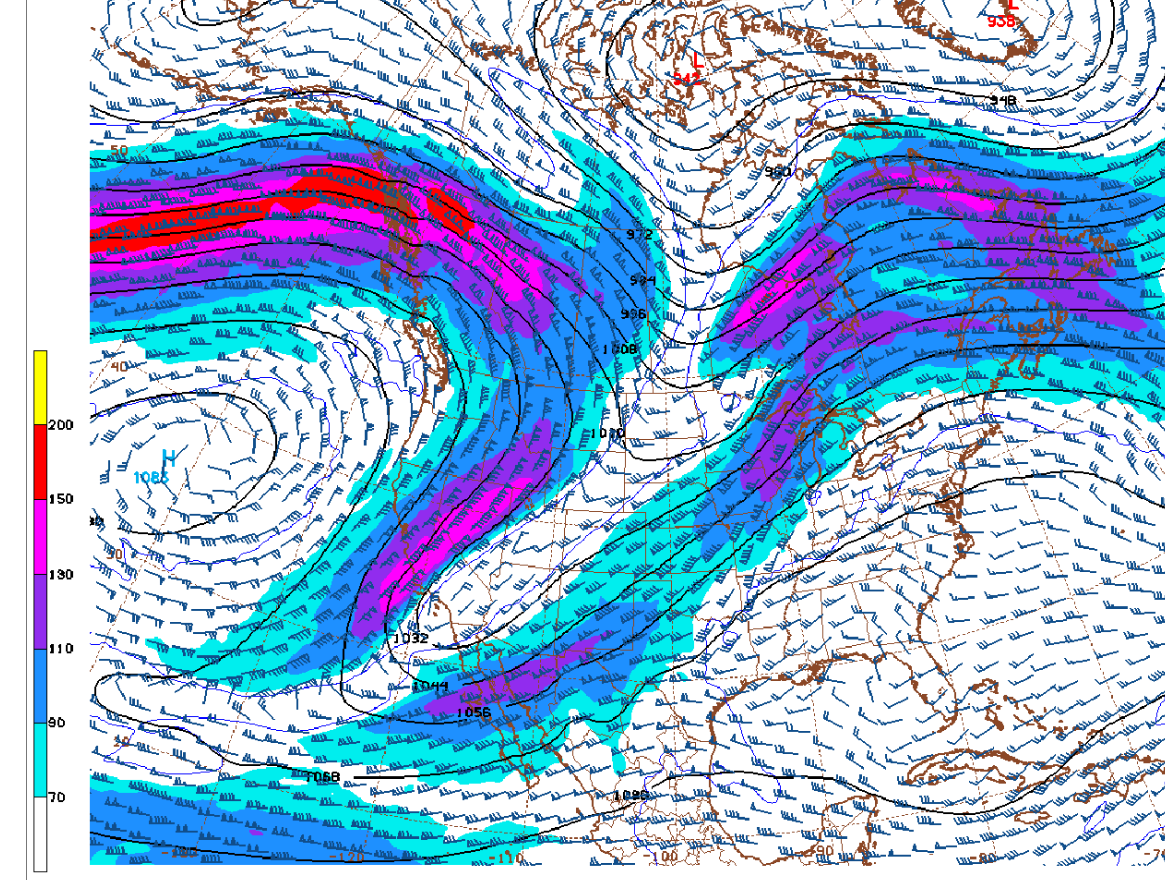 There is a weak jet streak in blue that's just under 100 mph(the units below are in KNOTS).