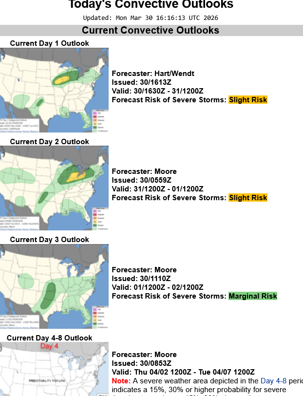 Below is an image of the assessment at Noon on March 30, 2026. Again, look for that bottom 2 windows (days 3-8) to start adding risk tomorrow. Mainly for days 3-4 tomorrow which will be for Friday and Saturday.