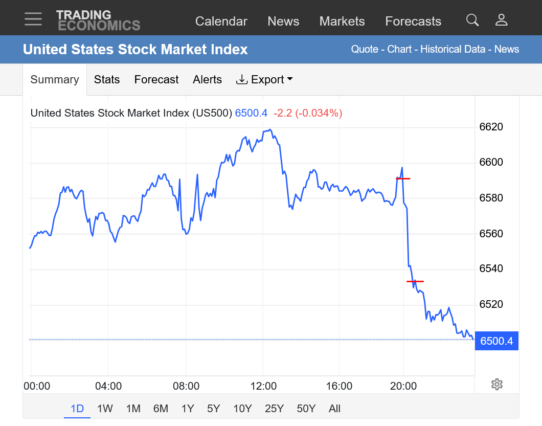 Donald Trump addressed the nation during prime time tonight to try to jaw bone the stock market higher with big lies. The red lines show the huge plunge lower during and just after his speech.