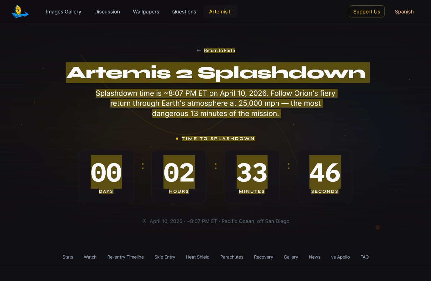 Splashdown time is ~8:07 PM ET on April 10, 2026. Follow Orion's fiery return through Earth's atmosphere at 25,000 mph — the most dangerous 13 minutes of the mission.