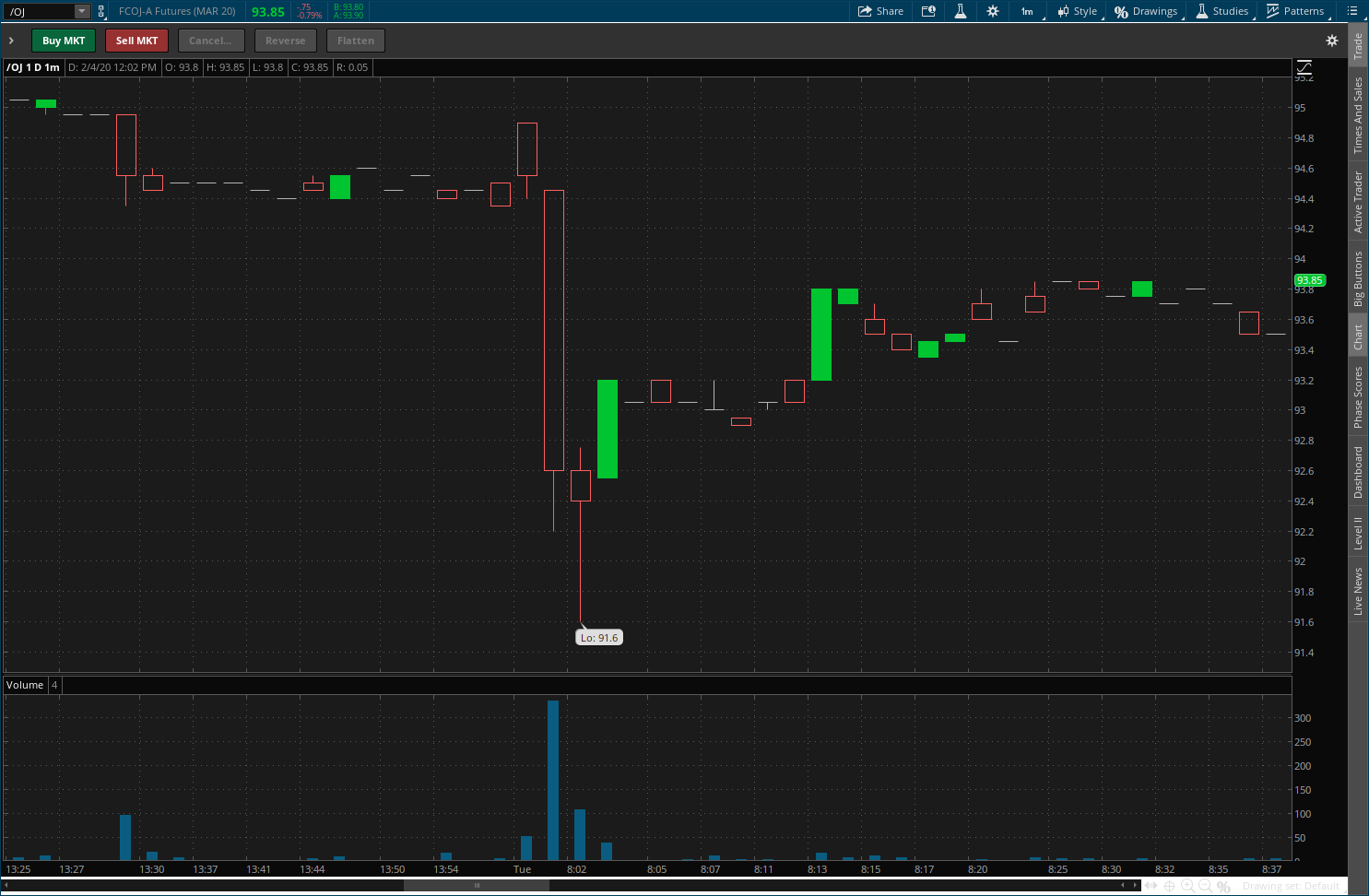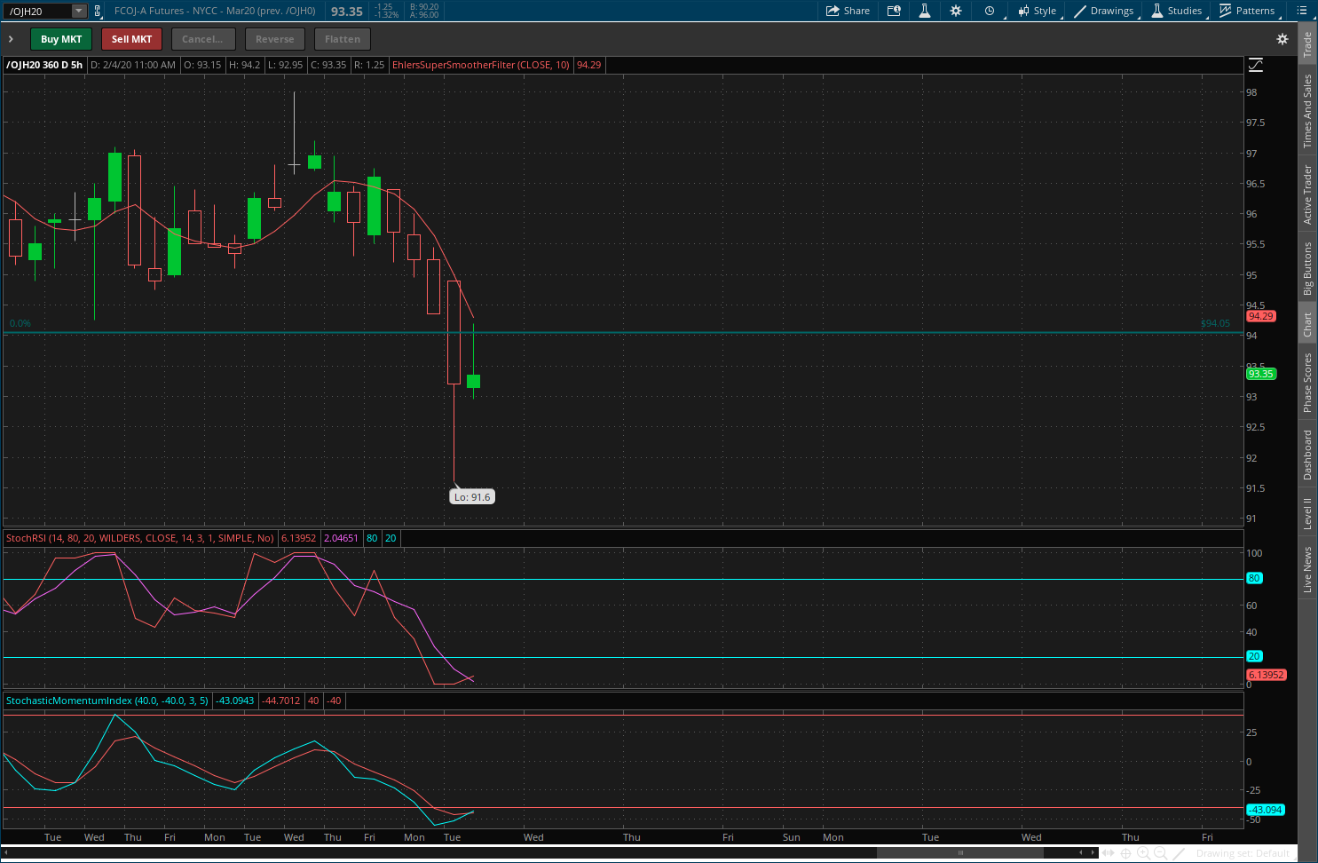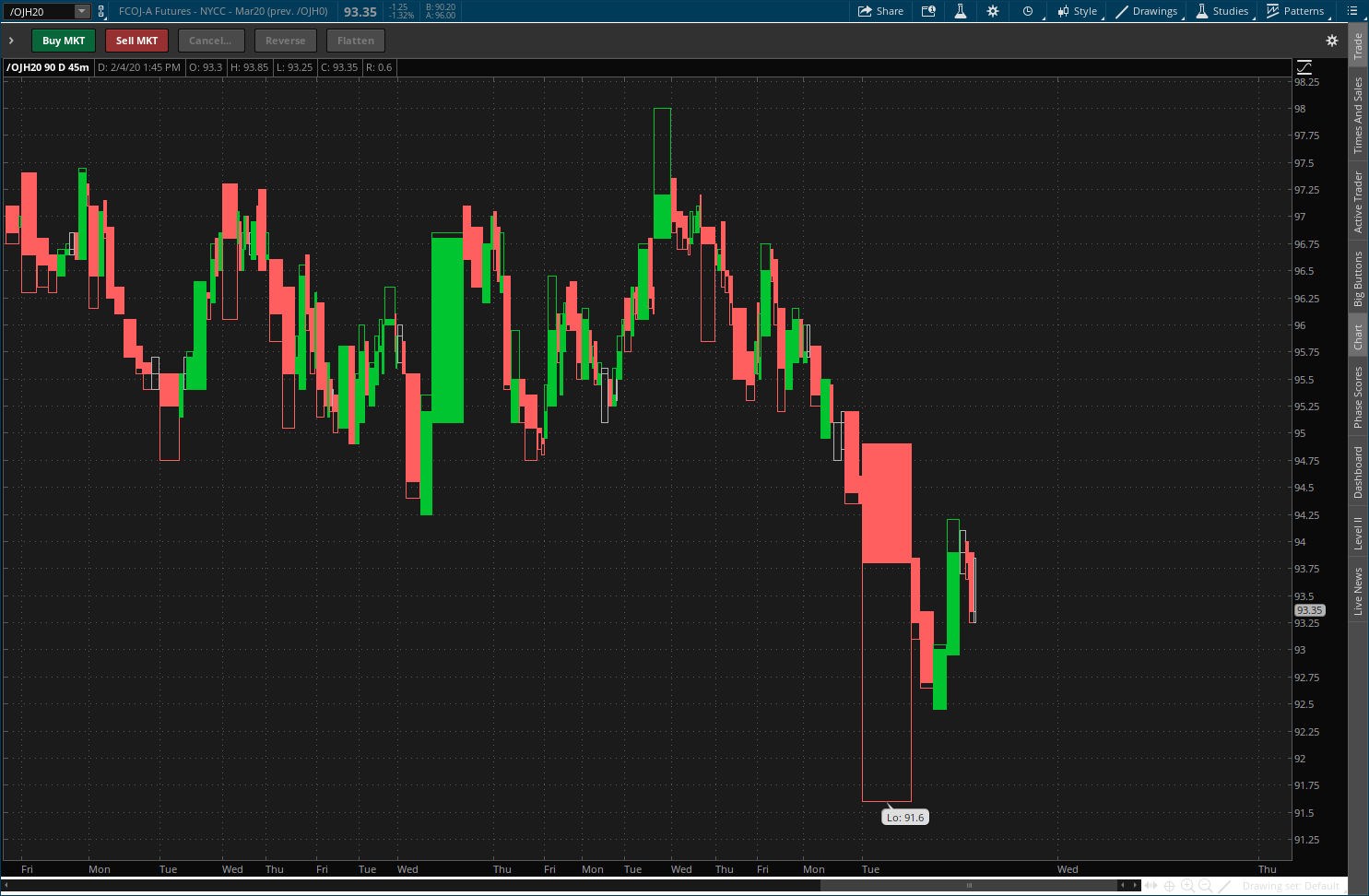 OJ spiked thru those life of contract lows (that had been holding as strong support for a very long time) on the open and hit a ton of stops, making a new low at 91.60.