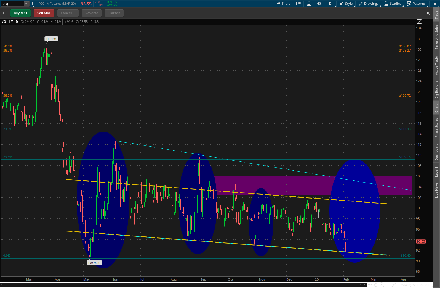 Opening first minute high volume flush of contract low. A normally quiet day's volume squeezed into the first one minute of trading. Bought a 2nd contract May at 97cent even to go with the previous 98.45 buy. Carrying a set of OJ balls now, the pair packing a $300 per penny punch. Price has come back to barely breakeven 97.70. Surely has all the earmarks of a cycle low node pinbar spike flush. OJ is the last remaining "soft" commodity to show some pizzazz. Coffee's done it. Sugar and cocoa, obviously. Lumber definitely. Cotton, for sure. If the masses turn to citrus for virus protection, well... If facemasks can sell out, surely OJ can fetch some demand. Potentially can zoom back over a buck with a vengeance. Has a real long congestion coil with alot of pent up energy to spring it. Fib retracements, even the minimal ones, portend a heck of a move. Best of all, I relish that NO ONE is talking about the juice! It's historically undervalued with both supply side and demand pressure bullish for the 2020 and 2021 ahead.