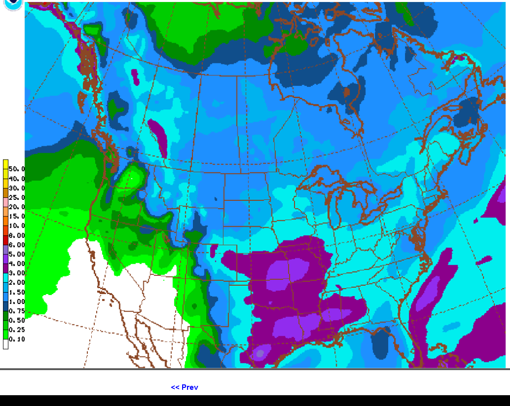 Note the 5+ inches in the South/Central US............too much rain.........same place that was shown yesterday but slightly farther south. Rain amounts peter out quickly headed northeast and in fact, by the time we get to the Eastern cornbelt, amounts have really tapered off.