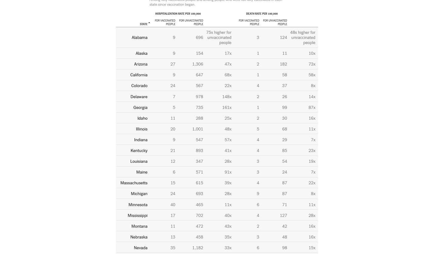 Starting with Alabama, where the hospitalization rate for people unvaccinated is 75 times greater than those vaccinated. The death rate for those unvaccinated is 48 times higher than those vaccinated.