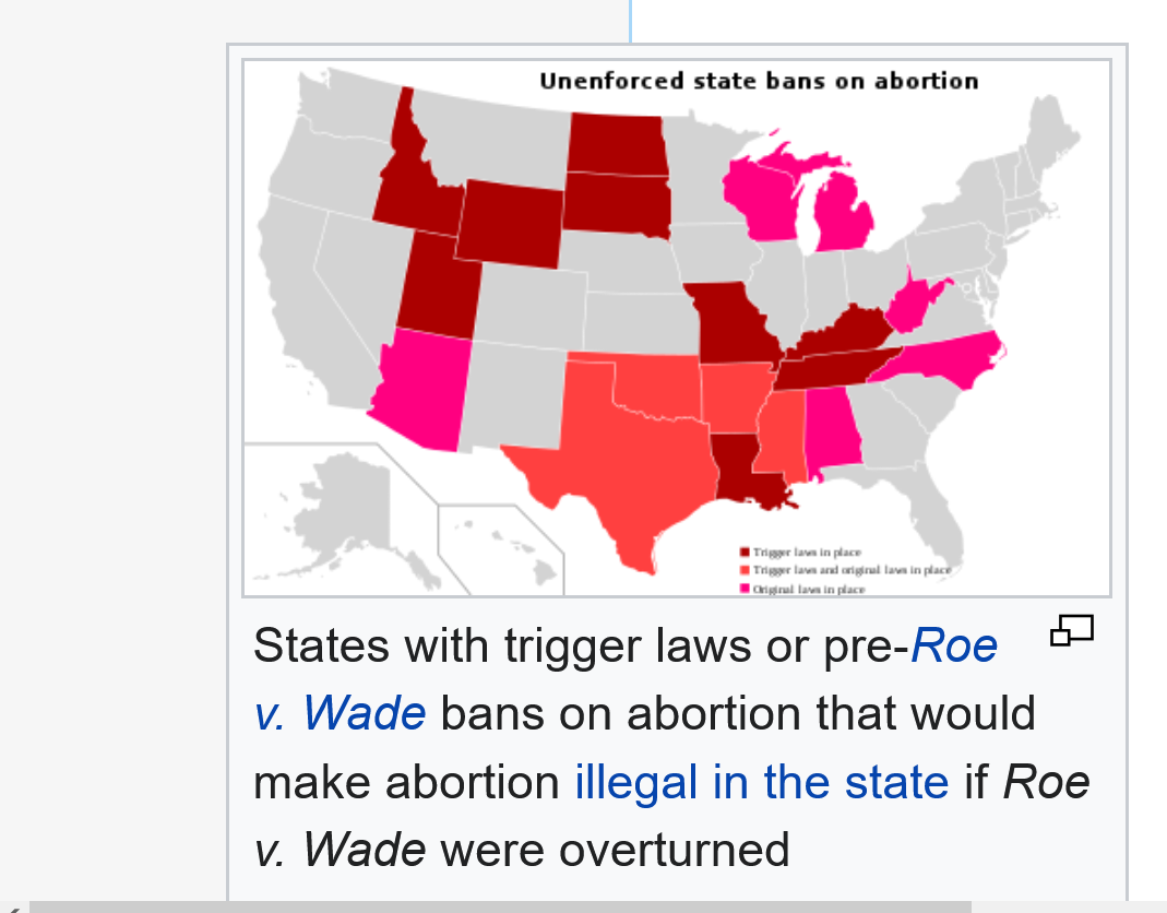 In the United States, thirteen states, Arkansas, Idaho, Kentucky, Louisiana, Mississippi, Missouri, North Dakota, Oklahoma,[1] South Dakota, Tennessee, Texas,[2] Utah, and Wyoming,[3] enacted trigger laws that would automatically ban abortion in the first and second trimesters if the landmark case Roe v. Wade were overturned.[4][5][6] As Roe v. Wade was overturned on June 24 2022,[7] these laws are presumably now in effect. Illinois formerly had a trigger law (enacted in 1975) but repealed it in 2017.[8][9][10] Ten states, among them Alabama, Arizona, Michigan, North Carolina,[11][12] West Virginia, and Wisconsin, as well as the already mentioned Arkansas, Mississippi, Oklahoma, and Texas, still have their pre-Roe v. Wade abortion bans on the law books; the law in Texas is permanently enjoined by court order. Those laws are presumably now enforceable since Roe has been overturned. According to a 2019 Contraception Journal study, the reversal of Roe v. Wade and implementation of trigger laws (as well as other states considered highly likely to ban abortion), "increases in travel distance are estimated to prevent 93,546 to 143,561 women from accessing abortion care".[13]