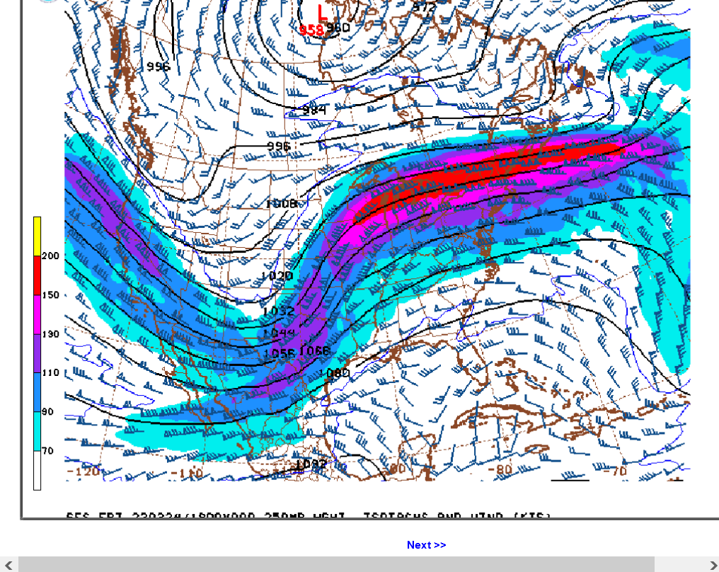 The jet stream at 250 mb, around 34,000 feet/6.5 miles up is strongest over the Great Lakes at almost 180 knots or over 200 mph.