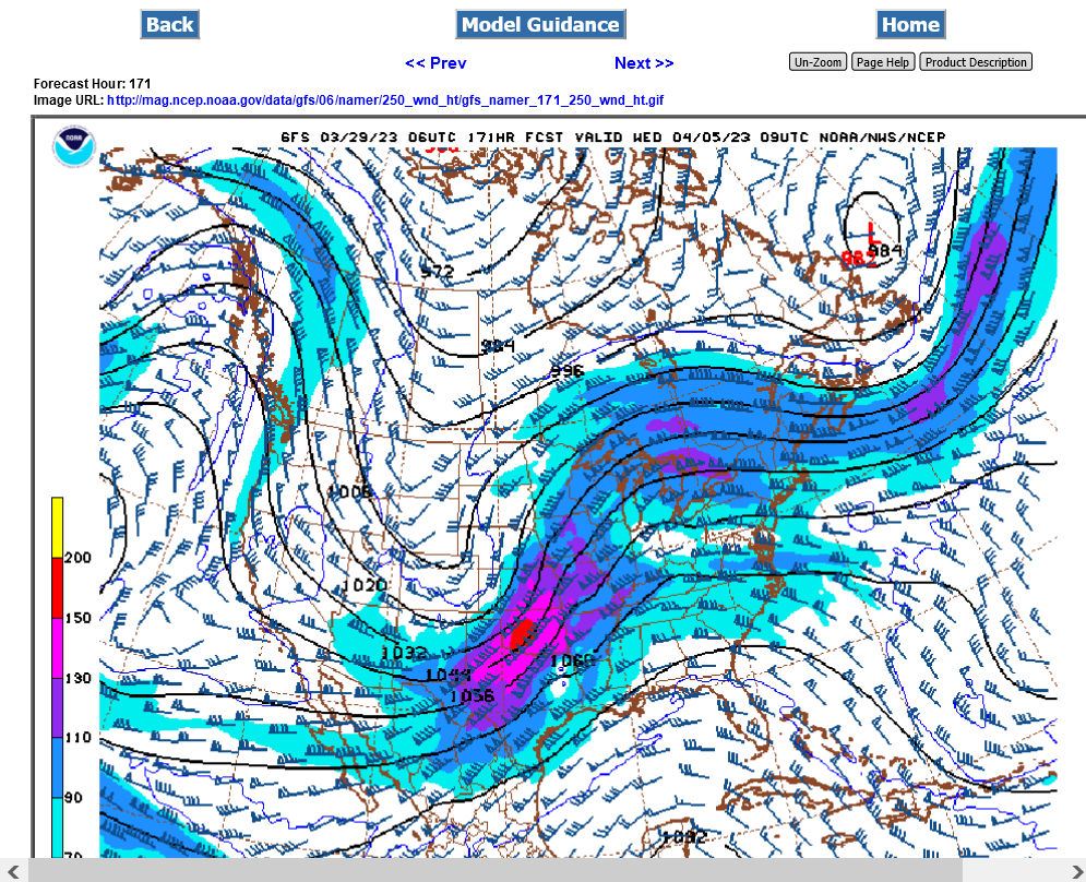 Overnight April 4/5 jet stream at 250 mb above. Another textbook severe weather outbreak for the Spring season based on enough very warm/humid, buoyant/unstable air surging northward at that time of year., underneath a powerful jet stream that maximizes the lift ahead of a surface cold front that focus's/maximizes the lift at the contact point of where the cold dense air is getting underneath the warmer lighter air at ground level and pushing it upwards!