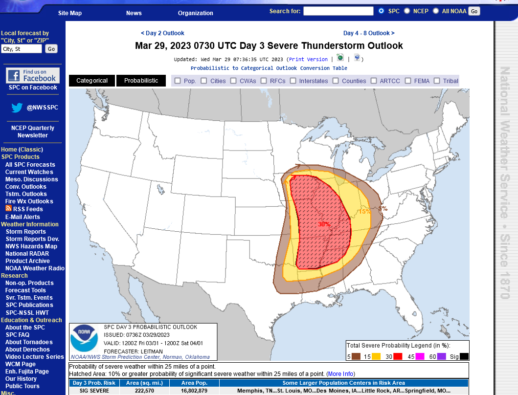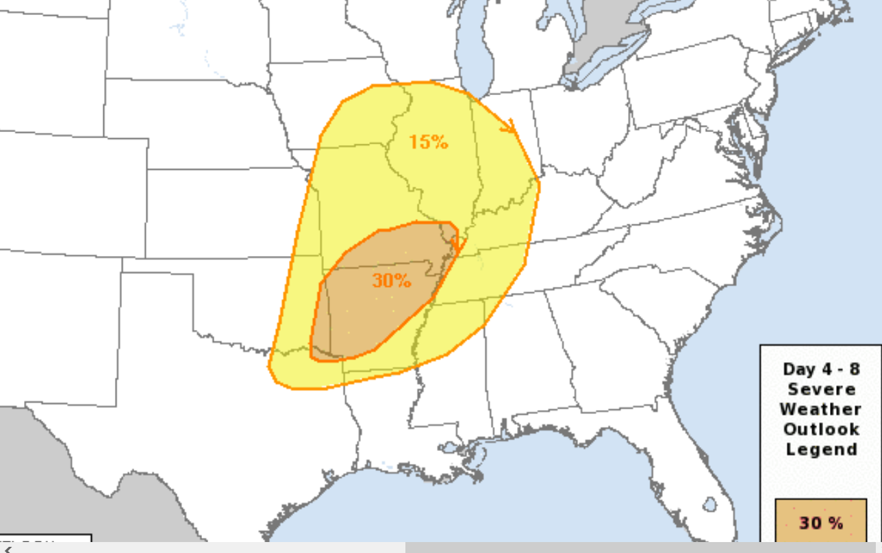 Here on Monday, Friday, is currently day 5 on the outlook below. As we get closer, the Severe Storm Prediction Center will refine the risk area and probabilities. You can also read their daily discussions below the risk maps.
