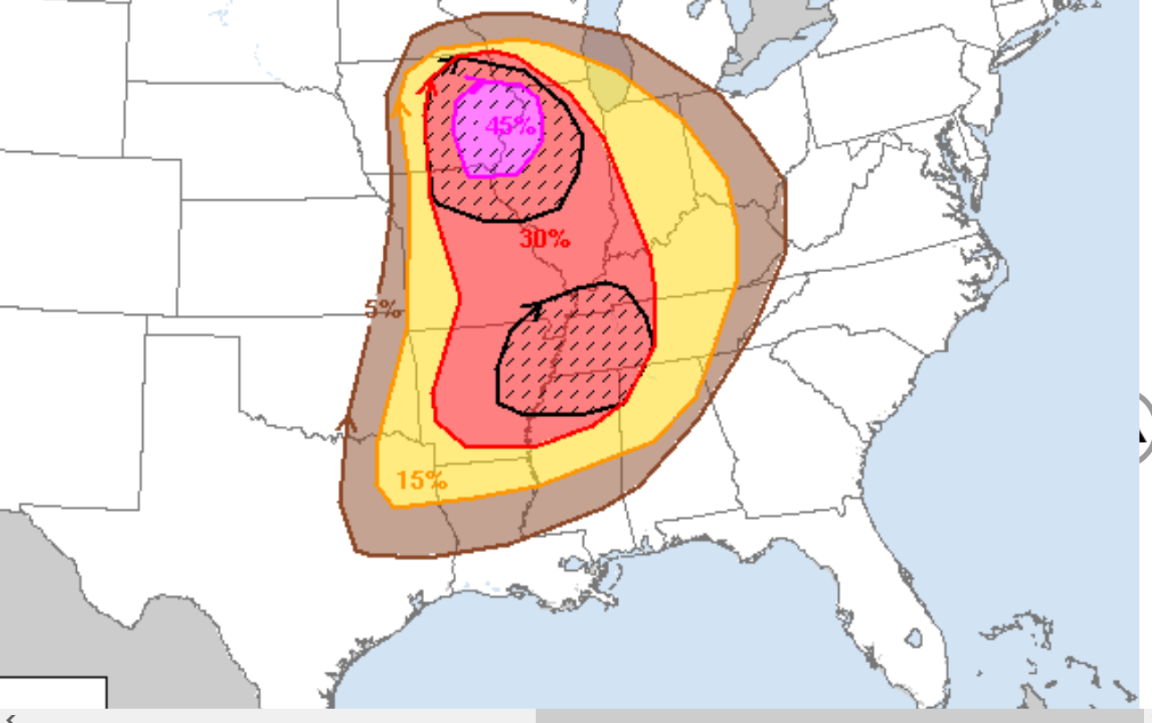 1. Risk for a tornado within 25 miles of where you are. +10% in the moderate risk areas. Note the 15% area AR/MS/TN/MO/IL/KY borders. This is the main area of concern. Severe thunderstorm winds rarely kill people. Violent, long track tornadoes do. See discussion below.