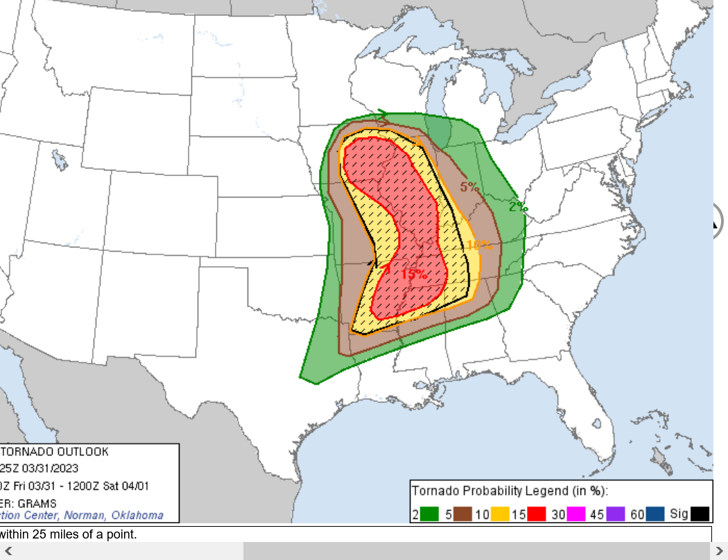 2. Risk of a tornado within 25 miles of any point = Near 15%. Long track, violent tornadoes are possible