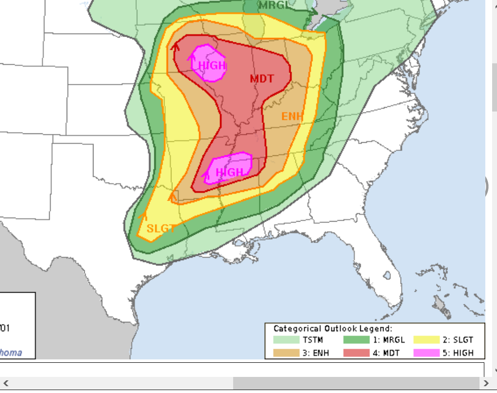 The Severe Storm Prediction Center has just added 2 pockets of HIGH risk, which is the top level. This is a snapshot image, for the rest of the afternoon but not updated below. Use the link for updates: