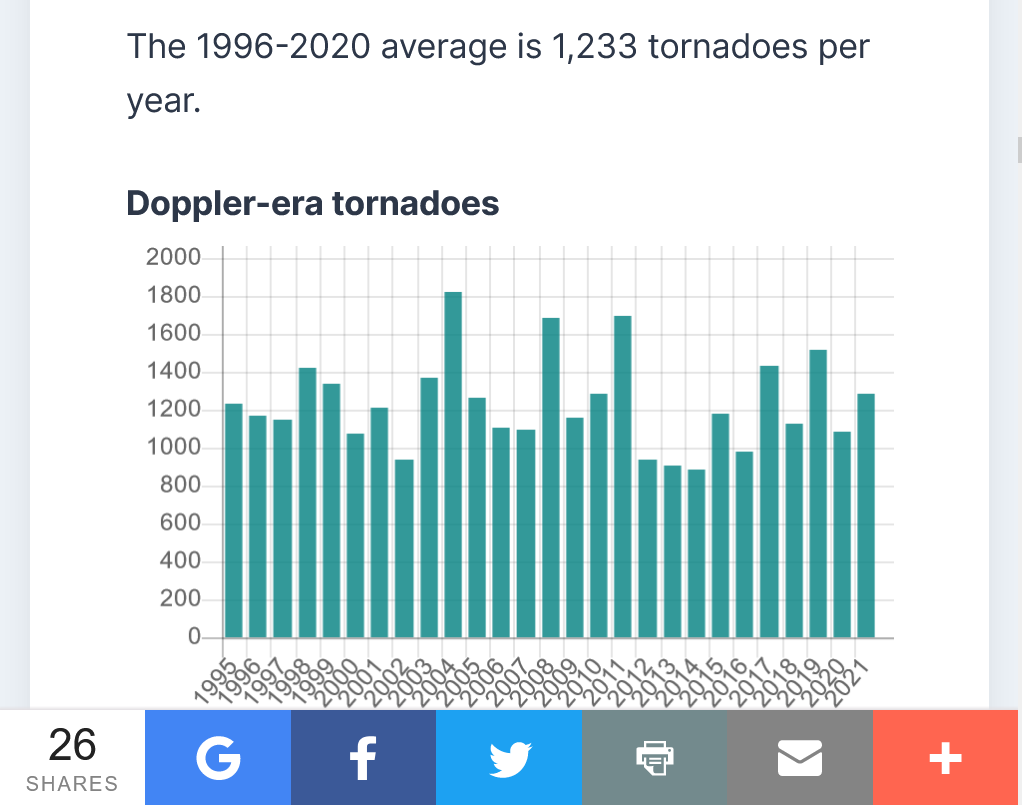 Detected tornadoes suddenly doubled in the 1990's. This was entirely from a leap forward in technology with the installation of NEXRAD Doppler radars around the country. Unlike previous radar systems, these can see the wind and detect tornadoes. The smaller tornadoes often went undetected prior to this technology and it was those type of tornadoes that saw the entire increase. The strongest tornadoes, EF3+ have actually been decreasing from climate change.
