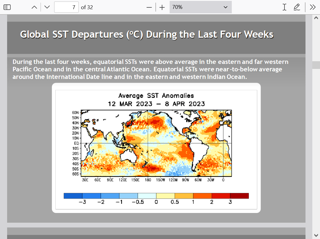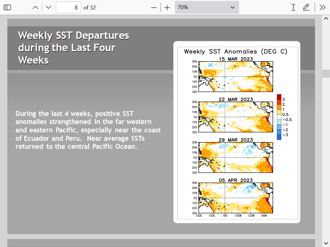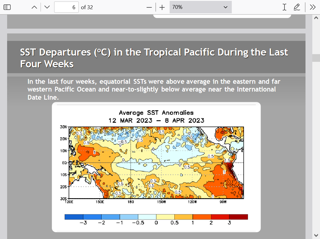 2. The ENSO readings to determine El Niño/La Niña come from a specific region of the tropical Pacific. There’s a very strong correlation with weather patterns downstream, especially with strong events. However, the correlation can Be greatly modulated by several factors. What are temps like in the surrounding Pacific Ocean?