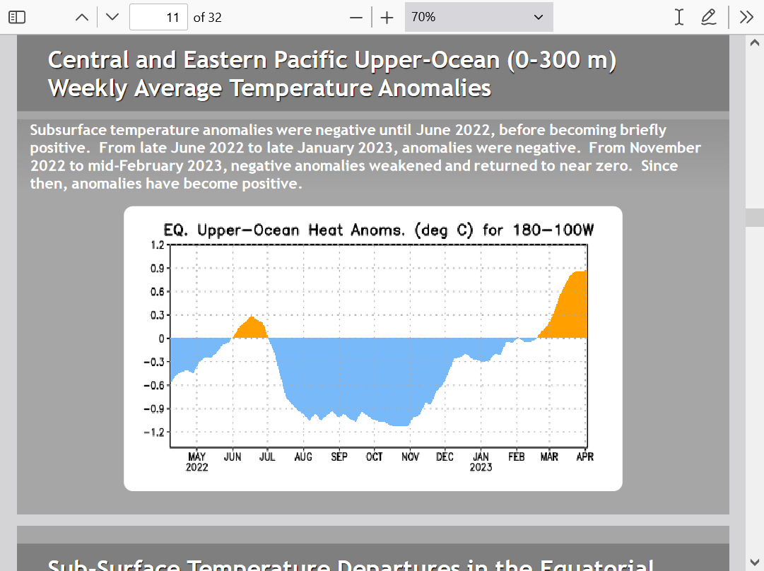 subsurface water temps seem to make El Niño,a given. This means a resumption of global warming with very high confidence……after the La Niña driven pause.