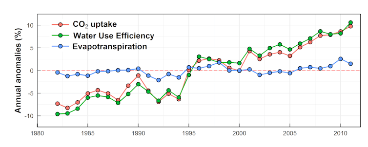 One such adaptation is to close the stomata slightly to allow CO₂ to enter with less water getting out. Under increasing atmospheric CO₂, the overall result is that CO₂ uptake increases while water consumption does not. This is exactly what we have found on a global scale in our new study. In fact, we found that rising CO₂ levels are causing the world’s plants to become more water-wise, almost everywhere, whether in dry places or wet ones.