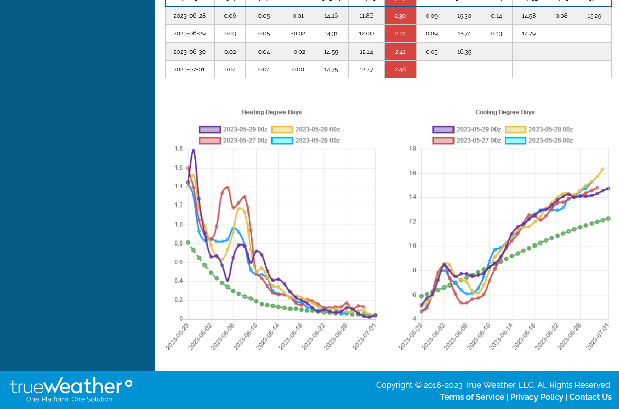 Note the purple line on the graph to the right/below, the last 45 day outlook from the EE model. Even though things heat up late this month and especially in early July, the forecast LOST around 16 CDDs vs the previous outlook in brown!