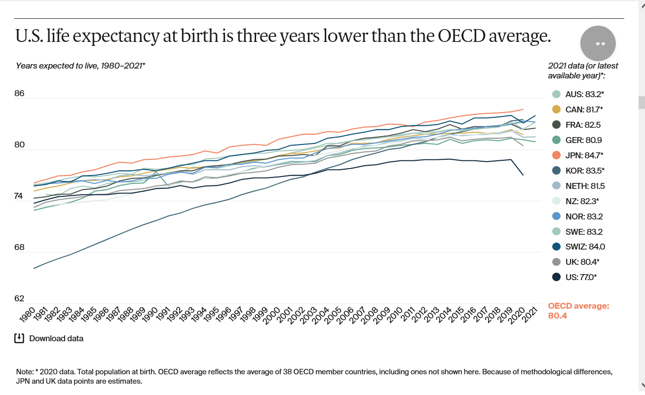 It's often been said that we pay so much more because we have the best health care system. That may be true in some realms but the bottom line is how is this contributing to life expectancy? This graph below is misleading because we lead the world in massive drug overdose deaths and homicides, especially from guns which lowers the life expectancy. Regardless, take note at how much shorter we live in the US compared to every other country that spends MUCH LESS on health care. Note the disparity/gap consistently growing the last 2 decades. People in other countries with socialized healthcare are living longer and longer because of advancements in medicine.......Americans are not!