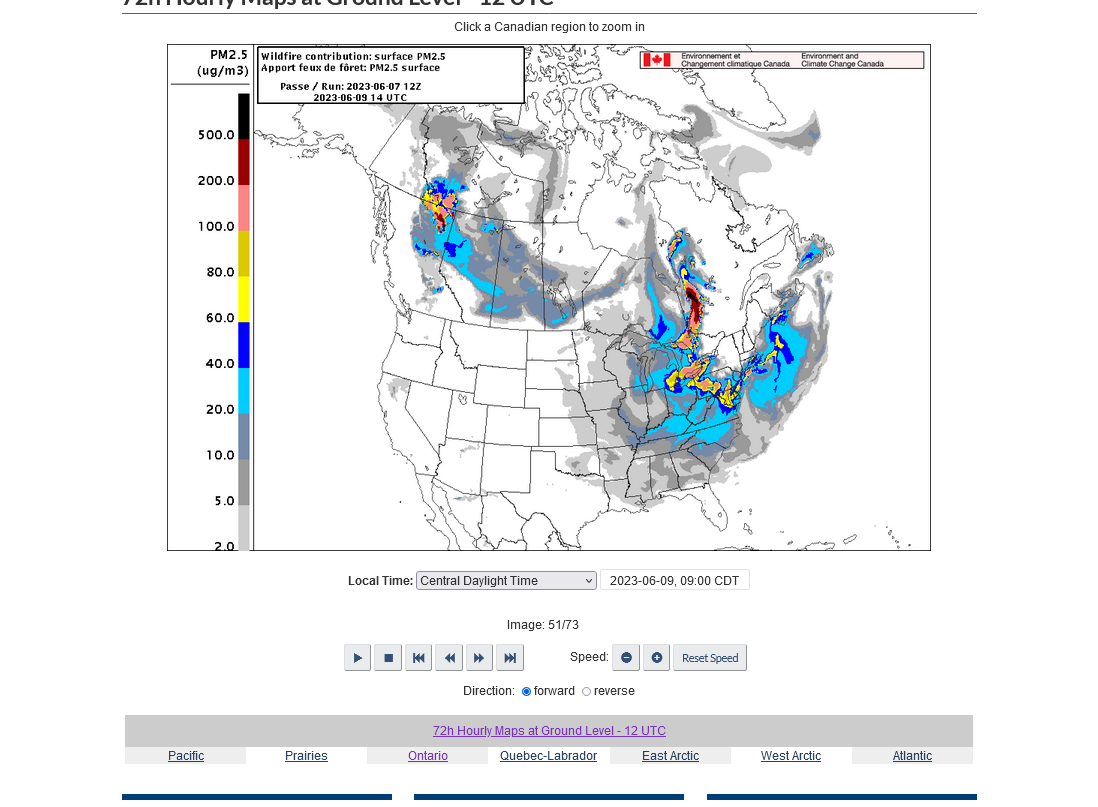 After going to the loop, you can hit your cursor on the image to get a zoomed in look of the 72 hour smoke plume map/loop. The frozen image below is zoomed into Ontario for 2am CDT/3am EDT.