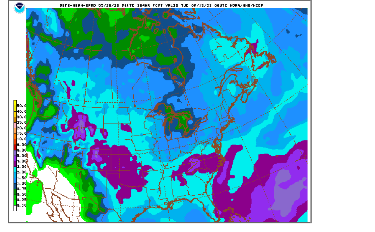 I continue to side with the much drier European ensemble model that continues to stay pretty dry thru 2 weeks(The GEFS is the wettest with almost double the rains in the Cornbelt).