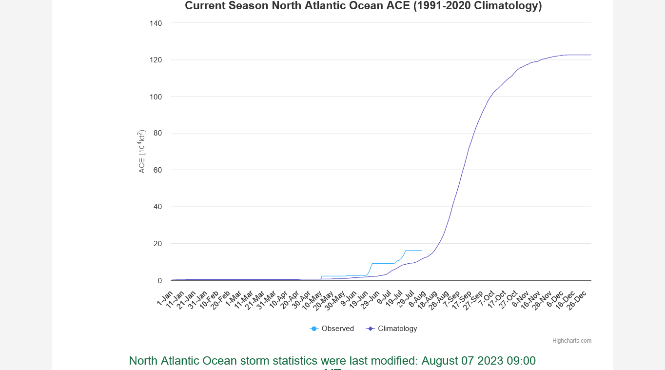 Historically, 90% of hurricanes have happened AFTER this date. Blue line below is August 7, 2023.