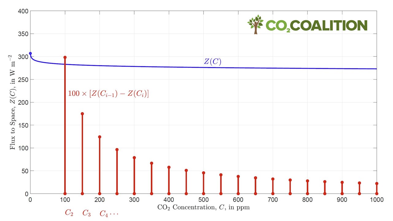 The vertical red lines show the decrease of flux to space caused by successive increases of the CO2 concentration C by 50 ppm increments. The increments are so small that they need to be multiplied by a factor of 100 to be clearly visible on the graph. Except for concentrations C that are almost zero, every doubling of CO2 concentrations decreases the radiation to space by 3 W. For example, the first red bar show that increasing C from 50 ppm to 100 ppm decreases the radiation to space by 300/100 W/m^2 = 3 W/m^2.”