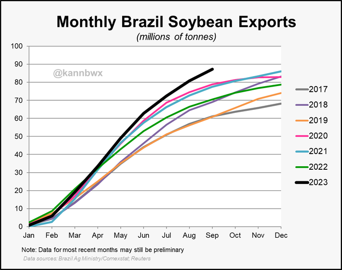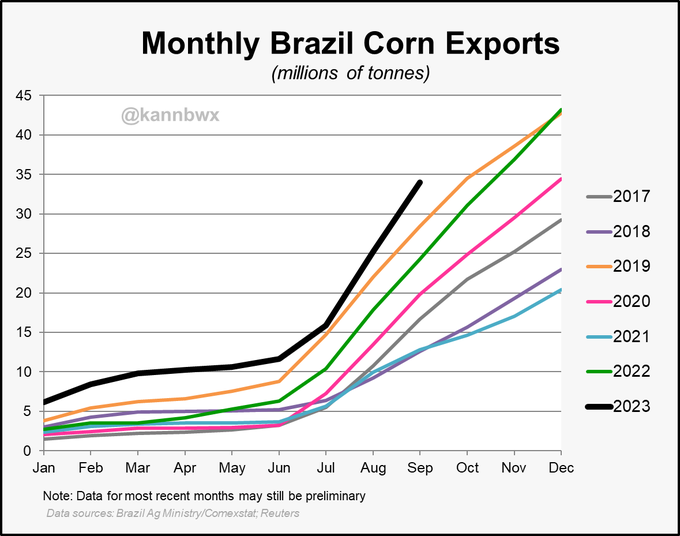 #Brazil's exports of #corn & #soybeans have reached a new realm in 2023 Preliminary data suggests combined Jan-Sep shipments rose 22.6 million tonnes (866 million bushels) above the period's prior record set in 2020 58% of Jan-Aug corn+soy exports went to #China