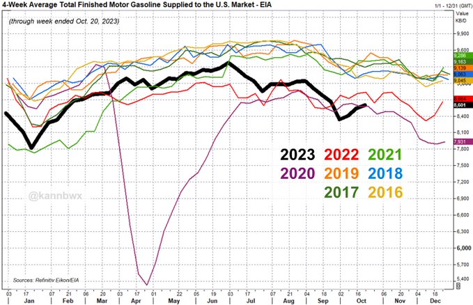 However, implied U.S. motor gasoline demand is not great, down around 8% from "normal" levels. The 4-week bottom at the end of September was actually the week's lowest since 1997. I'm not close enough to this market to explain why, but let me know if you have any thoughts.