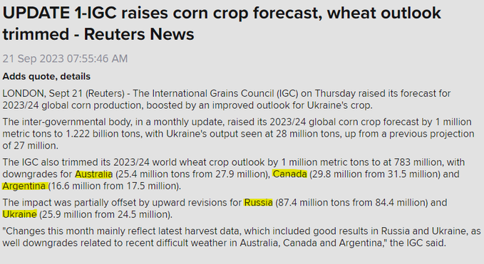 Strong grain crops in the Black Sea are offsetting losses in rival exporters. IGC sees 23/24 Ukraine #corn and #wheat as well as Russian wheat output higher than previously expected while wheat harvests in Canada, Australia and Argentina shrink.